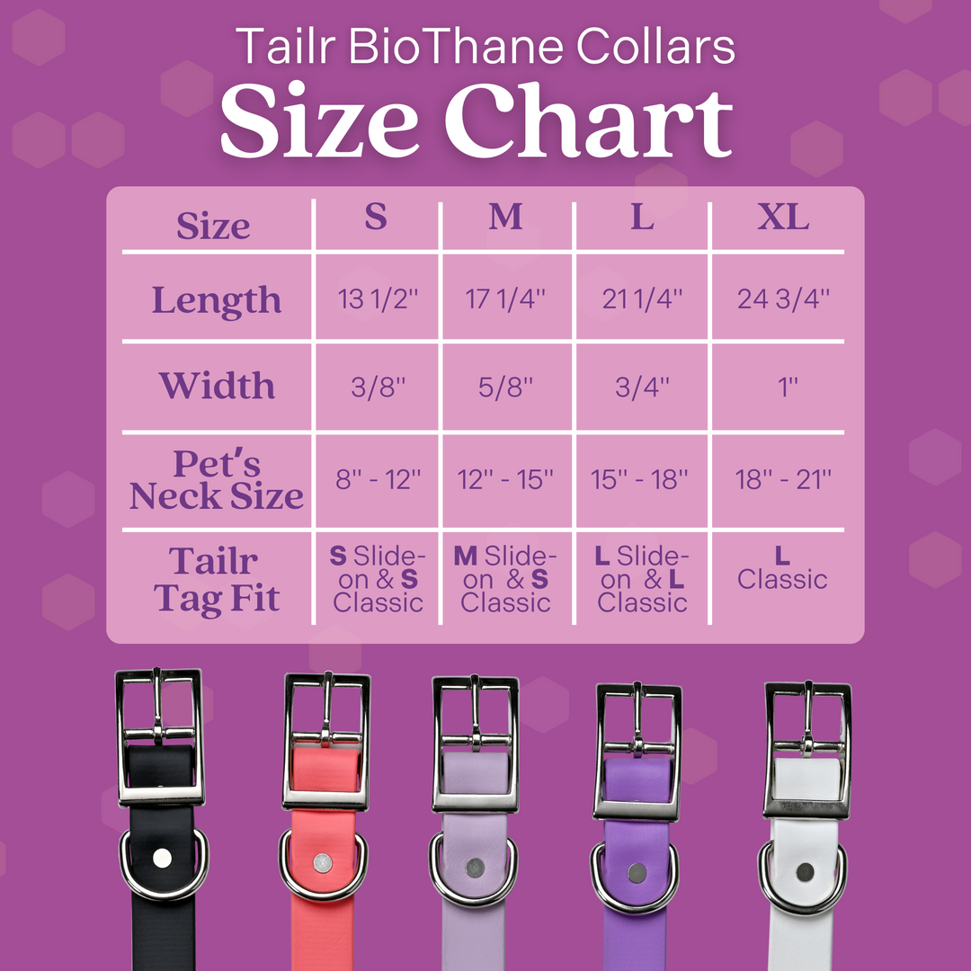 Tailr BioThane collars connect with the Hanging Tailr Tag, the Slide-On Tailr Tag, and the Tailr app to form a complete system to keep your dog safe, identifiable, and cared for.