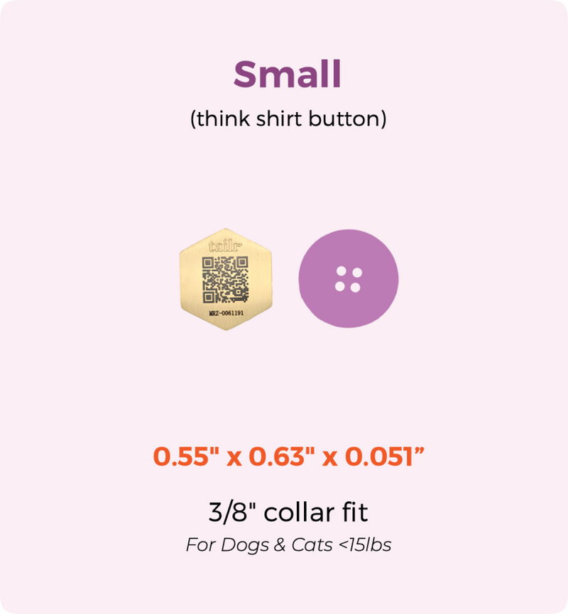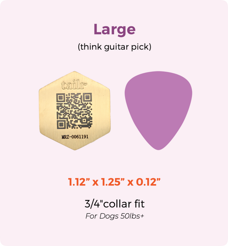 The Slide-On Tailr Tag fits securely on your pet’s collar, staying silent and tangle-free. Choose from three durable, weather-resistant sizes for your pet’s comfort—small (shirt button), medium (postage stamp), and large (guitar pick).