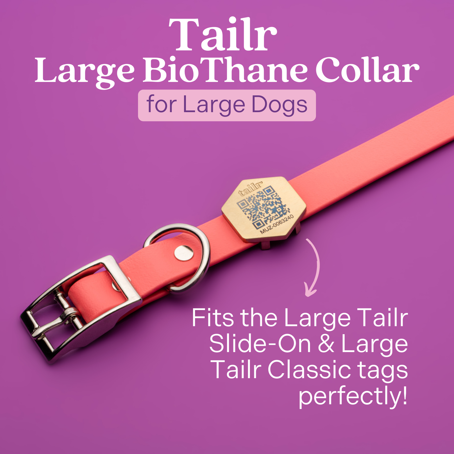 Tailr BioThane collars connect with the Hanging Tailr Tag, the Slide-On Tailr Tag, and the Tailr app to form a complete system to keep your dog safe, identifiable, and cared for.